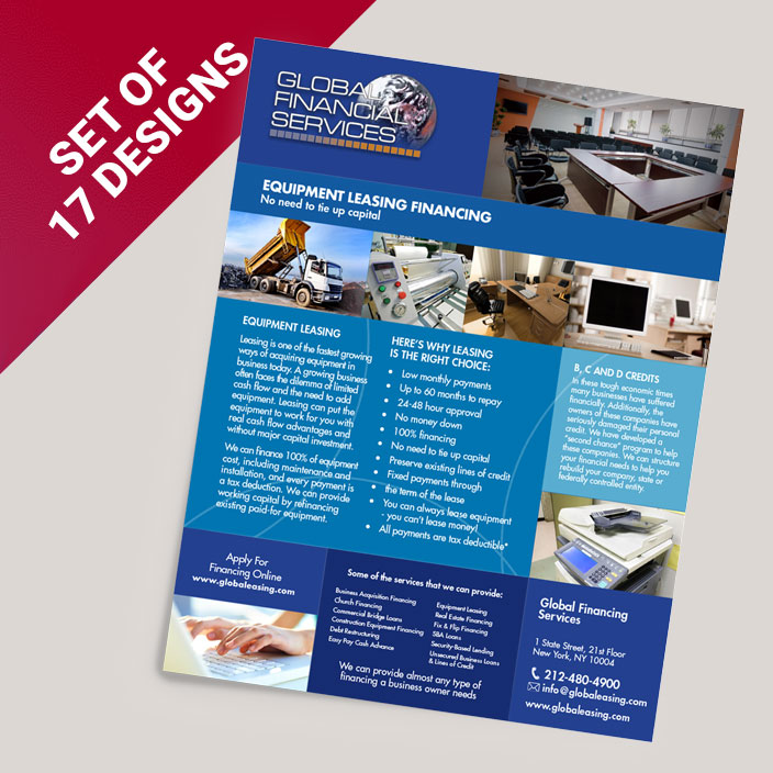 This set includes 17 unique flyer designs: 16 focused on individual financing services and 1 general flyer that highlights your full range of offerings. Each trifold is professionally designed and fully branded to give your company a consistent, polished presentation across all marketing materials.